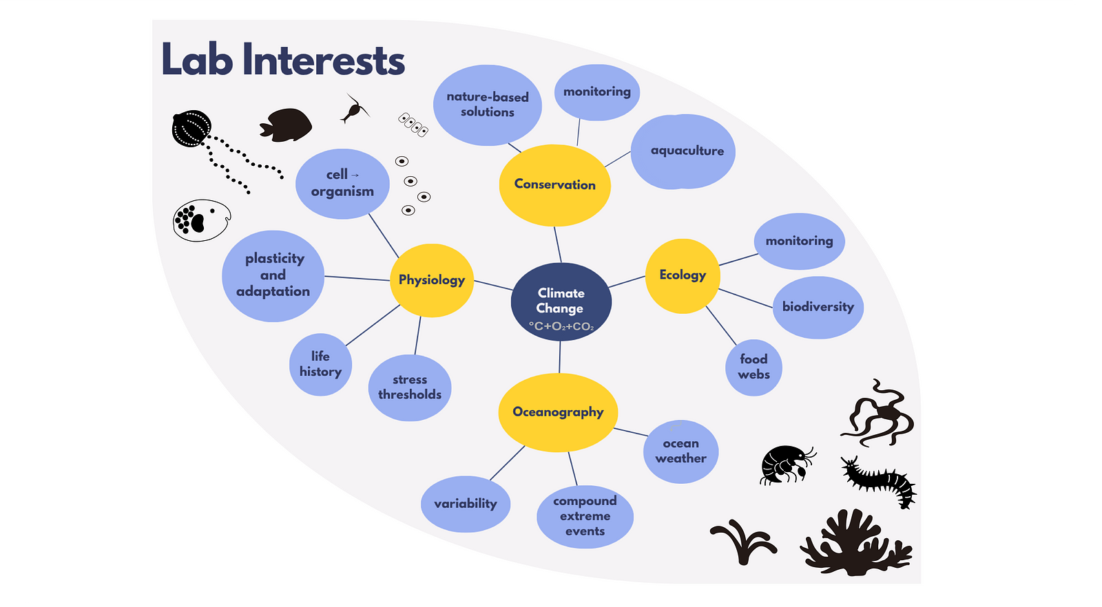 Physiological adaptation, marine invertebrates, multi-stressor experiments, climate resilience, integrated multi-tropic aquaculture, marine habitability and biogeography, compound extreme events, tropical marine biodiversity, oxygen, hypoxia and metabolism, marine conservation.